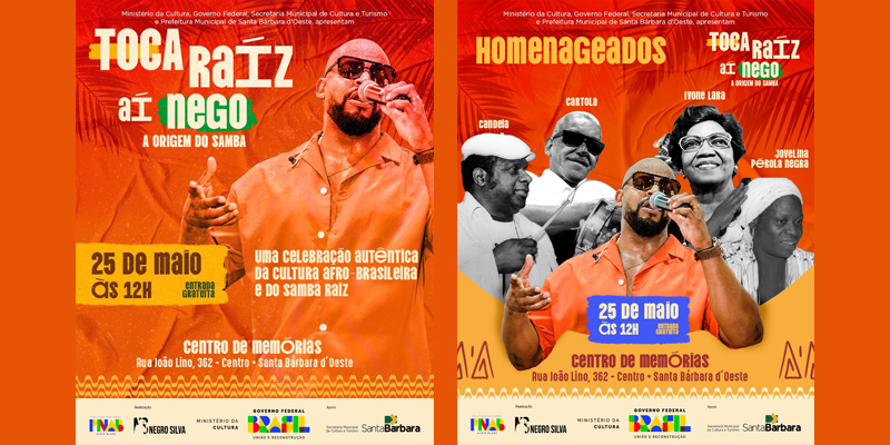 Toca Raiz aí, Nego! – A Origem do Samba é realizado com recursos da Lei Aldir Blanc por meio do Programa Nacional Aldir Blanc de Fomento à Cultura – PNAB e Secretaria de Cultura e Turismo de Santa Bárbara d´Oeste – SP.