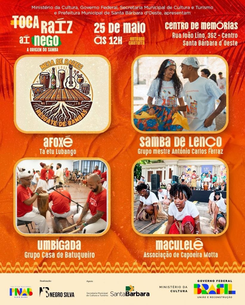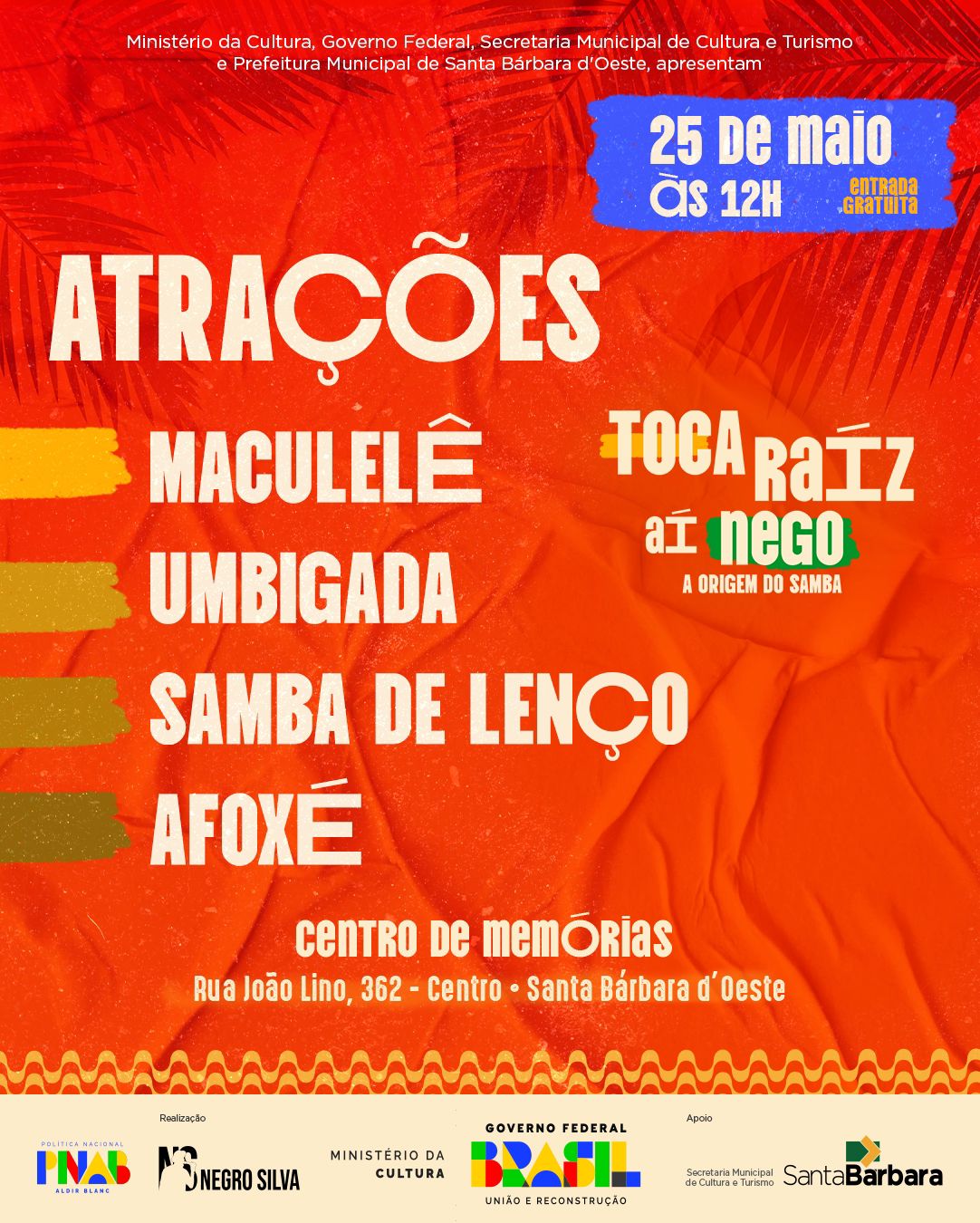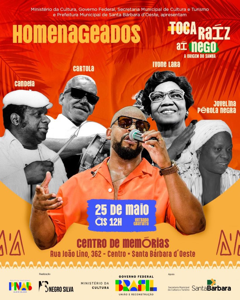 Toca Raiz aí, Nego! – A Origem do Samba é realizado com recursos da Lei Aldir Blanc por meio do Programa Nacional Aldir Blanc de Fomento à Cultura – PNAB e Secretaria de Cultura e Turismo de Santa Bárbara d´Oeste – SP.